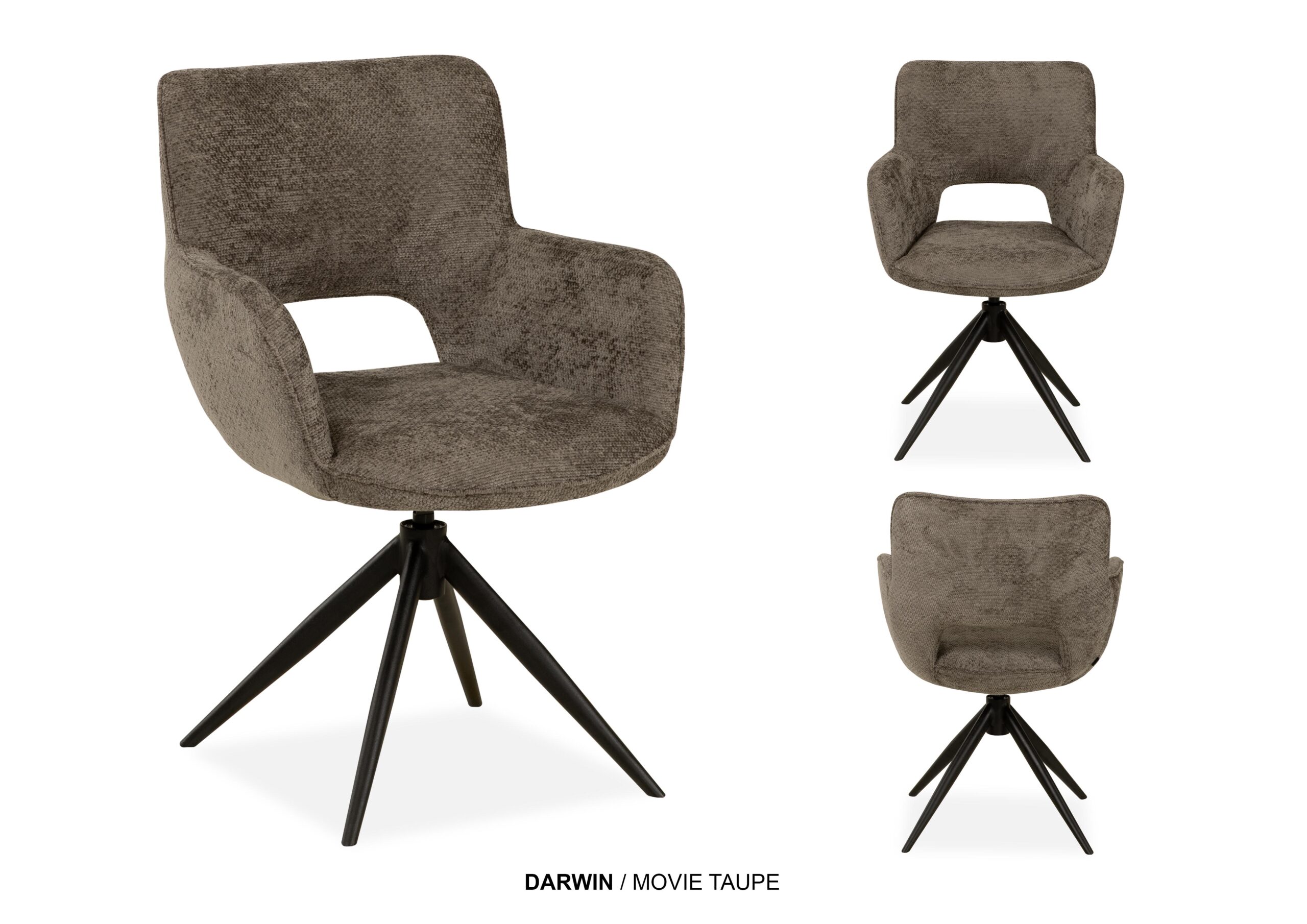 De stoel Darwin is verkrijgbaar in 4 kleuren van heerlijke zachte stof Movie; Natural, Taupe, Curry en Hazel